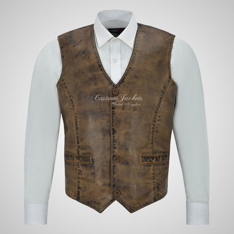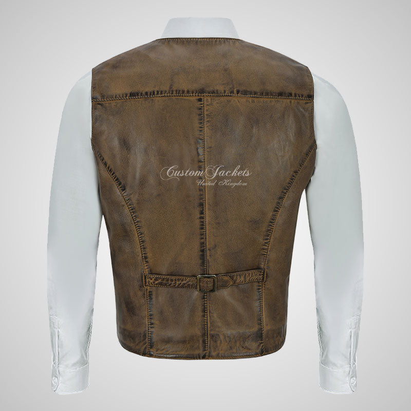 YORK Men's Dirty Vintage Leather Waistcoat Soft Waxed Leather Vest
