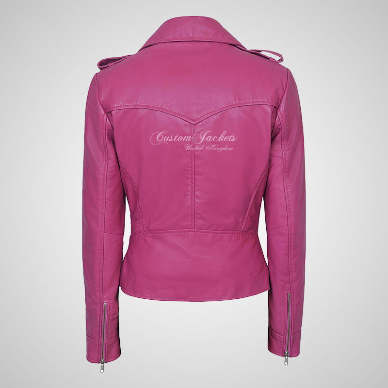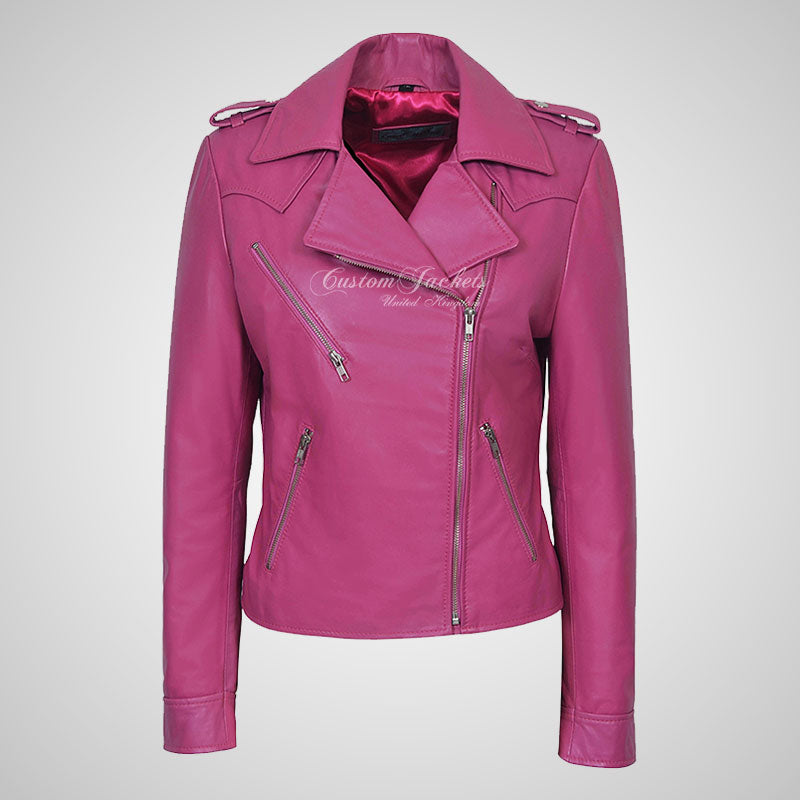 Introducing KATE 2 Ladies Biker Leather Jacket, a fitted masterpiece crafted from real lamb leather. In a sleek black vintage and pink color, this women leather biker jacket exudes timeless style and sophistication. Biker detailing adds a touch of texture and visual appeal, while the asymmetrical zip closure provides a unique and edgy look. Perfect for bikers or those seeking a bold fashion statement, this jacket combines style, comfort, and durability into one unforgettable piece. Elevate your wardrobe and embrace the essence of biker chic with our Ladies Biker Leather Jacket.