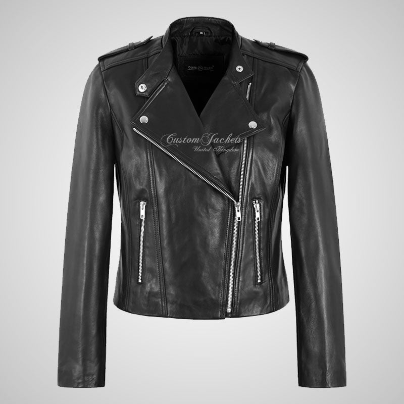 Introducing our Ladies Fitted Leather Jacket, a stylish biker-inspired piece that blends casual fashion with edgy appeal. Crafted from soft lamb napa leather, this jacket offers a luxurious and comfortable feel. The fitted silhouette accentuates your curves while exuding confidence. With its lapel collar featuring a trendy band detail, this jacket adds a touch of attitude to your outfit. The asymmetrical zip fastening adds a modern twist to the classic biker style, making it a versatile and fashionable choice. Whether you're heading out for a night on the town or looking to elevate your everyday look, this fitted leather jacket is the perfect statement piece for any occasion.