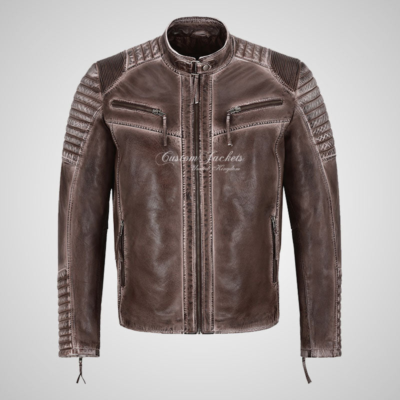 Introducing our Brown Crust Biker Leather Jacket, crafted with premium vintage lamb leather in a rich coffee color. This biker leather jacket for men is designed for those who appreciate the timeless appeal of a classic biker style. The quilted shoulders add a touch of rugged sophistication, while the outer pockets provide convenient storage for your essentials. The front zip closure ensures a secure fit and adds to the overall edgy aesthetic. With its distressed and waxed finish, this jacket exudes a vintage charm that is both stylish and distinctive. Embrace your inner rebel and make a statement with our Brown Crust Biker Leather Jacket. It's the perfect choice for those seeking a combination of fashion, functionality, and a touch of retro flair.