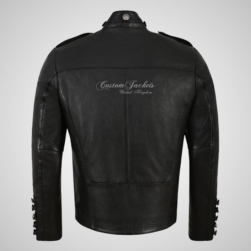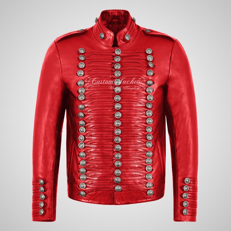 Introducing our Men's Military Parade Style Leather Jacket, a masterpiece crafted with meticulous care and attention to detail. This jacket embodies the essence of military grandeur, designed to make a bold statement wherever you go. The studded front adds a touch of regal sophistication, while the band collar exudes a commanding presence. Available in both black and red colors, you can choose the shade that best suits your style and personality. Each jacket is crafted with precision using premium quality leather, ensuring durability and long-lasting comfort. Whether you're attending a formal event or seeking to elevate your everyday look, our Men's Military Parade Style Leather Jacket will set you apart with its distinctive style and timeless appeal.