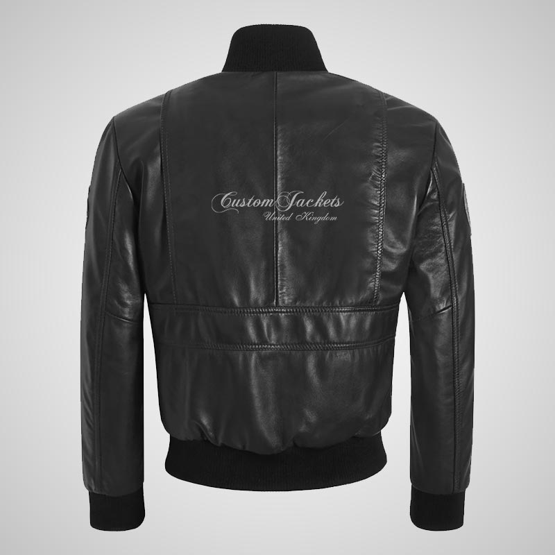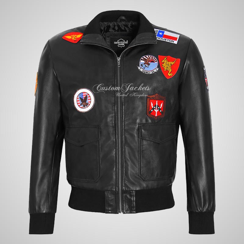 Introducing the TOP GUN Leather Bomber Flight Jacket in Black, a classic and top-selling bomber jacket crafted from genuine leather. This iconic piece features badge detailing on the front and arms, adding a distinctive touch to its rugged appeal. Designed with rib-knitted collars, cuffs, and bottom hem, it offers both style and comfort. Perfect for men seeking a sleek and timeless look, this jet black bomber jacket is an essential wardrobe addition.