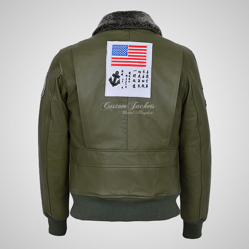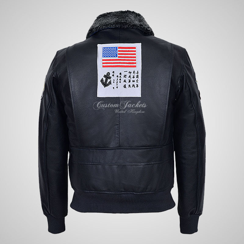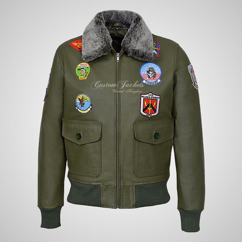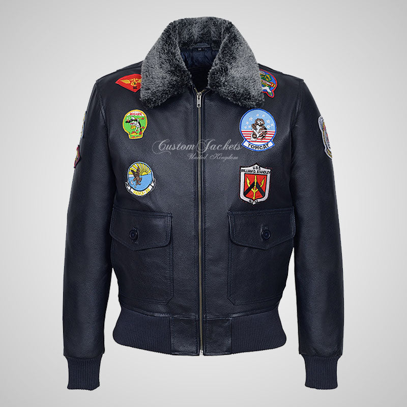 Introducing our TOP GUN Men's Fur Collared Bomber Leather Jacket in Green hide and Navy hide with Badges, a true homage to the iconic movie that inspired it. Crafted from thick cow leather, this jacket offers durability and a touch of luxury. The bomber-style design with rib-knitted cuffs and hem stays true to the classic aviator aesthetic. The addition of badges enhances the jacket's authenticity and pays tribute to the TOP GUN movie. Whether you're a fan of the film or simply seeking a stylish and statement-making leather jacket, our TOP GUN Men's Fur Collared Bomber Leather Jacket in Black with Badges is the perfect choice. Embrace the bold and adventurous spirit of the movie with this iconic outerwear piece.