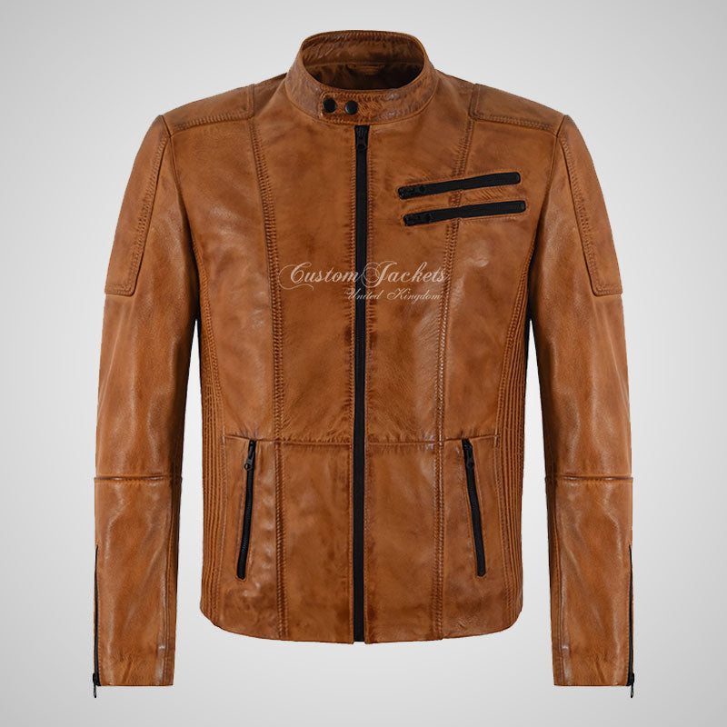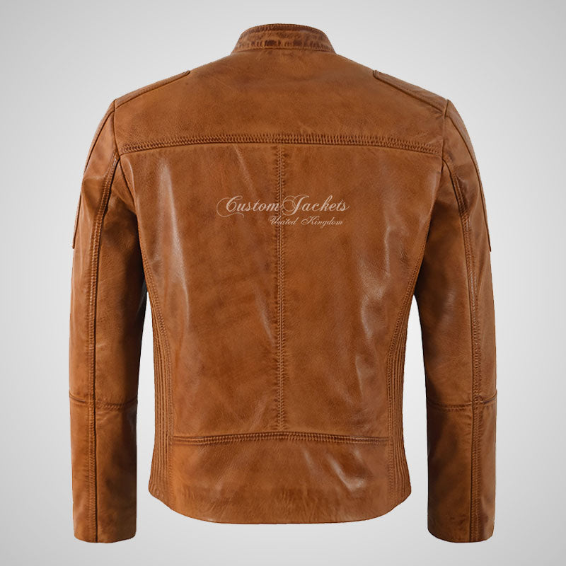 ZANE Mens Leather Biker Jacket Tan Waxed Soft Lambskin